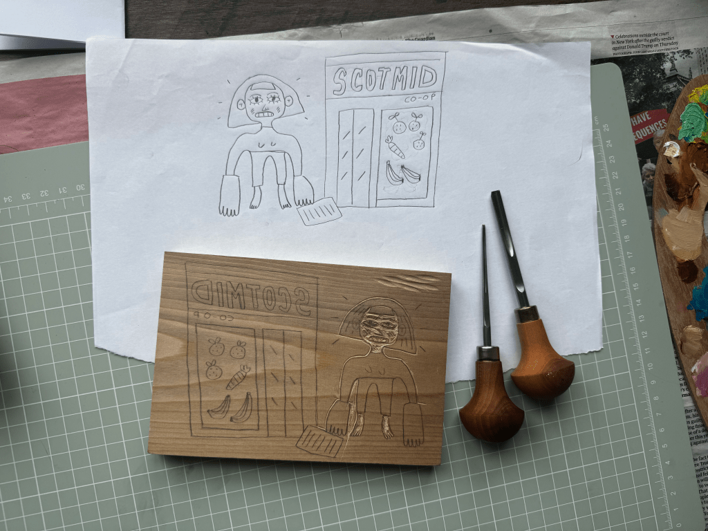 Feeling inspired by all my books and the cool print, I started my first ever woodblock print. It’s so much harder than lino!!! My hand is already aching and this is all I’ve done…