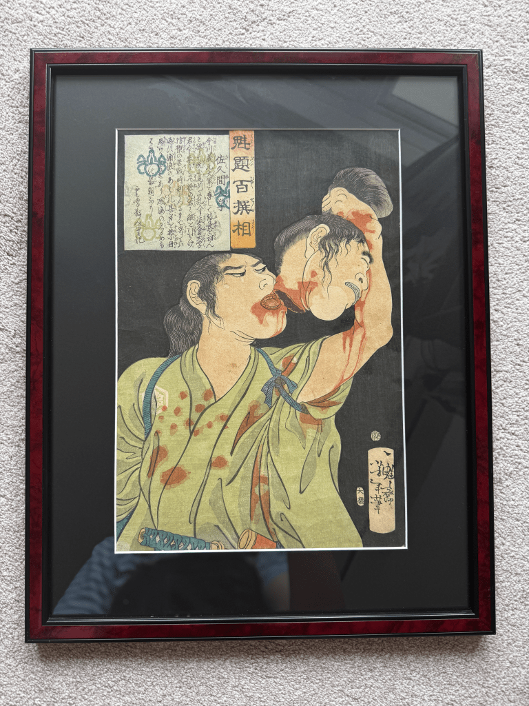 This weekend me and Matheus went to a village where they have loads of antiques shops. In one of the shops there were two original woodblock prints by Japanese artist Tsukioka Yoshitoshi. We really loved this one so bought our first ever piece o art. The lady told us it’s a print from the second run from woodblock. It’s from a series called ‘100 Warriors’ that the artist made, and in English this one is called ‘Sakuma Daigaku drinking blood from a severed head’.